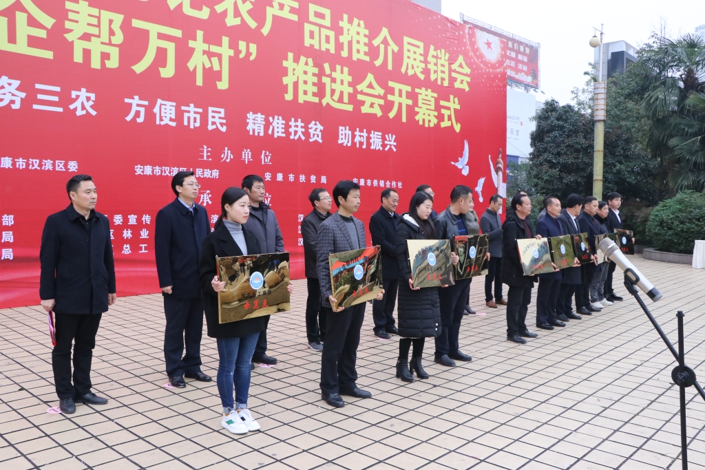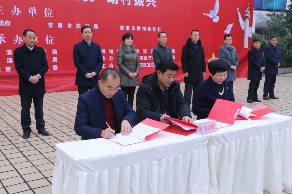 區(qū)委常委、副區(qū)長孫自余主持活動,區(qū)委副書記王懷中代表區(qū)委、區(qū)政府致辭;區(qū)委常委、區(qū)委組織部部長郭正鋒為陜西陽晨牧業(yè)股份有限公司等10個“萬企幫萬村”精準扶貧示范基地(點)授牌;市商務局副局長陳勇介紹安康(陽晨)生豬產業(yè)助力脫貧攻堅,確保市場供應安全“五進”活動情況;隨后在廣大市民的見證下,漢濱供銷電商公司、天瑞源公司與我公司簽訂了陽晨放心豬肉購銷協(xié)議。